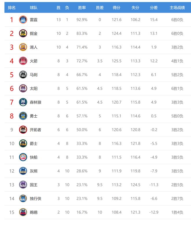 北京时间2025年11月16日,今日NBA有5场比赛,湖人、掘金、雷霆、森林狼、灰熊参与其中,赛后西部排名发生了变化。